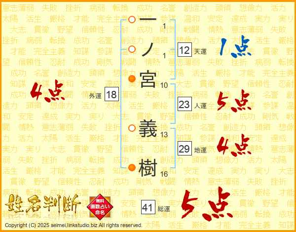 一(1画)ノ(1画)宮(10画) 義(13画)樹(16画)