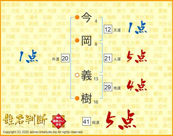 あなたの人生を表す1番重要な運勢です。生涯を通じて影響する総合運となり、主に50歳以降の晩年期に影響を及ぼします。苗字と名前の合計画数。