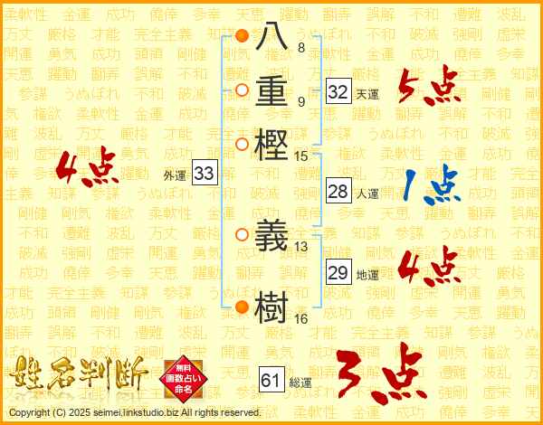 八(8画)重(9画)樫(15画) 義(13画)樹(16画)