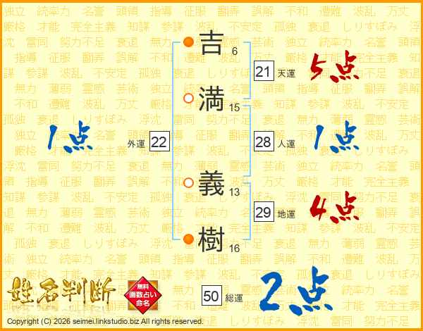 吉(6画)満(15画) 義(13画)樹(16画)