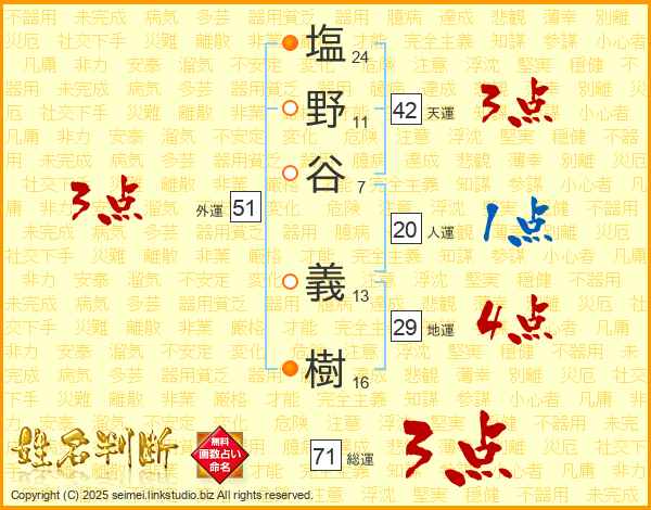 塩(24画)野(11画)谷(7画) 義(13画)樹(16画)