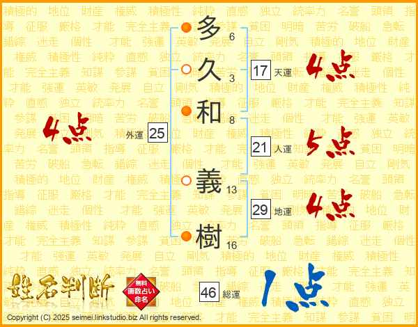 多(6画)久(3画)和(8画) 義(13画)樹(16画)
