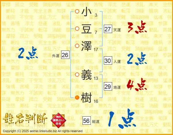 小(3画)豆(7画)澤(17画) 義(13画)樹(16画)