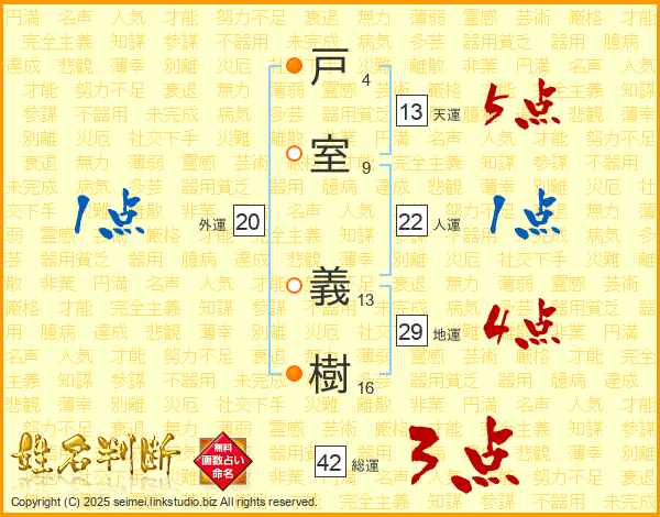 あなたの人生を表す1番重要な運勢です。生涯を通じて影響する総合運となり、主に50歳以降の晩年期に影響を及ぼします。苗字と名前の合計画数。