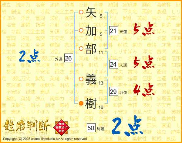 矢(5画)加(5画)部(11画) 義(13画)樹(16画)