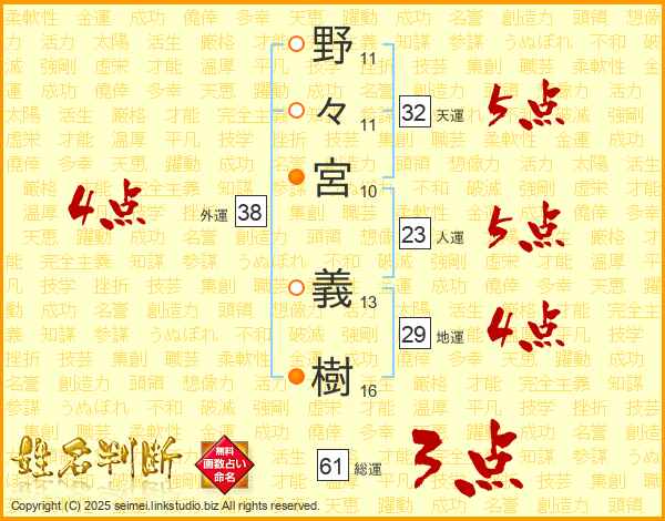 野(11画)々(11画)宮(10画) 義(13画)樹(16画)