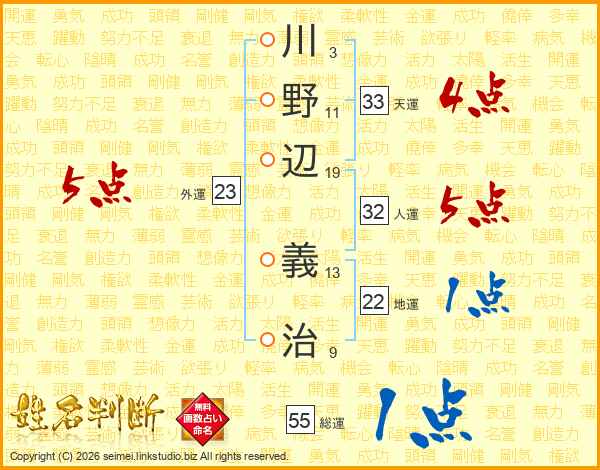 川(3画)野(11画)辺(19画) 義(13画)治(9画)