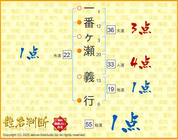 一番ヶ瀬義行さんの人運は33画の4点!