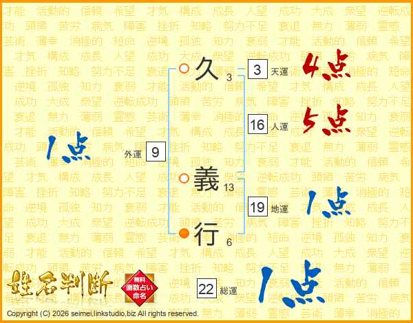 あなたの人生を表す1番重要な運勢です。生涯を通じて影響する総合運となり、主に50歳以降の晩年期に影響を及ぼします。苗字と名前の合計画数。