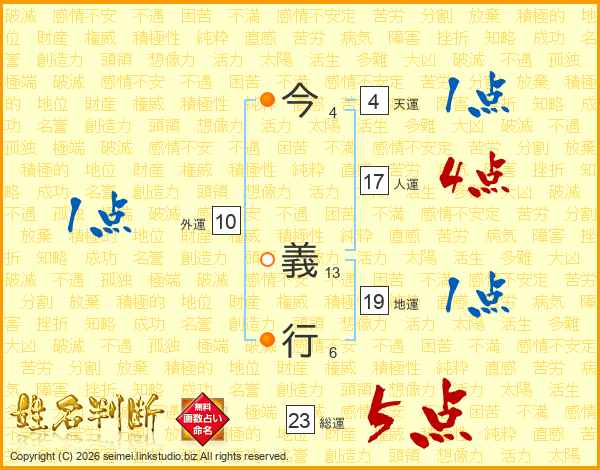 画数の奇数(○陽)と偶数(●陰)の配列で吉凶を占います。どちらかにかたよる名前は大凶名で避ける必要があります。画数の奇数偶数。