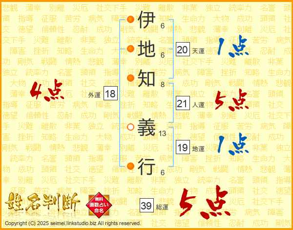 伊(6画)地(6画)知(8画) 義(13画)行(6画)