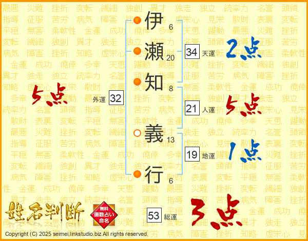 伊(6画)瀬(20画)知(8画) 義(13画)行(6画)