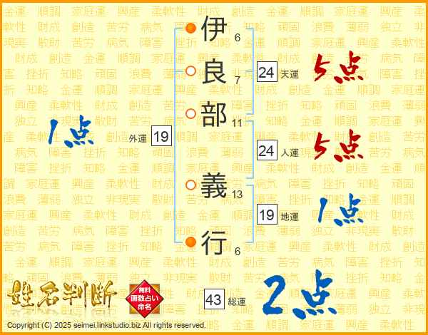 伊(6画)良(7画)部(11画) 義(13画)行(6画)