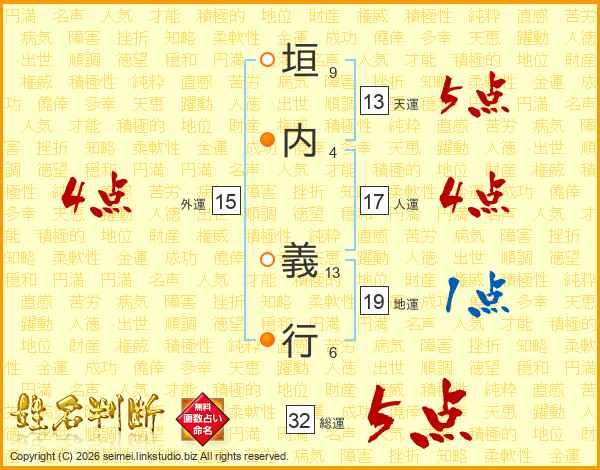 垣内義行さんの天運は13画の5点!