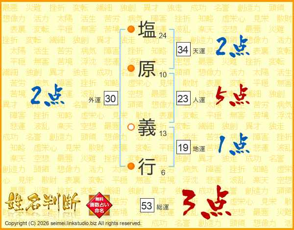 あなたの人生を表す1番重要な運勢です。生涯を通じて影響する総合運となり、主に50歳以降の晩年期に影響を及ぼします。苗字と名前の合計画数。