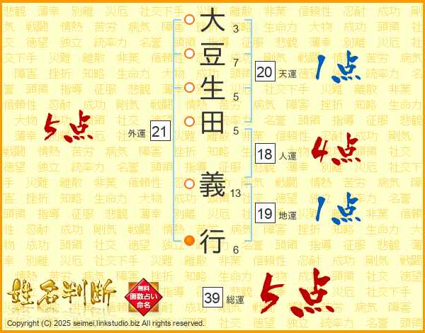 大(3画)豆(7画)生(5画)田(5画) 義(13画)行(6画)