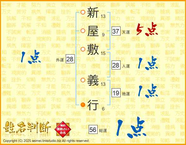 新(13画)屋(9画)敷(15画) 義(13画)行(6画)