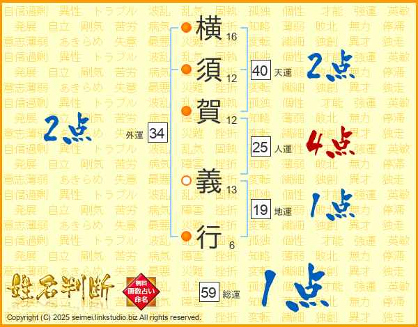 横(16画)須(12画)賀(12画) 義(13画)行(6画)