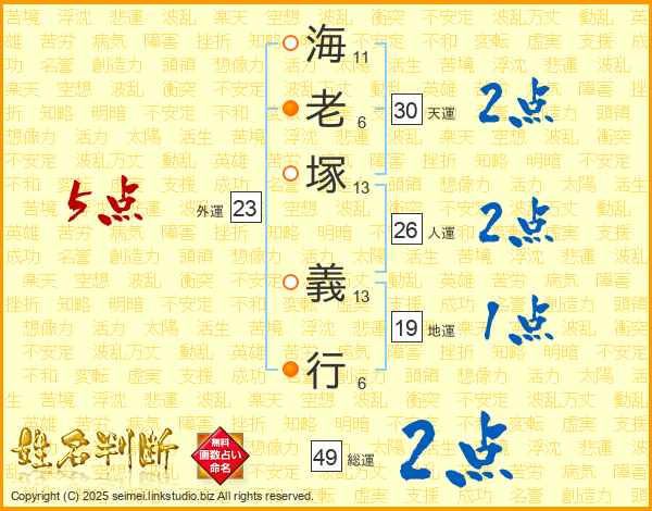 海(11画)老(6画)塚(13画) 義(13画)行(6画)