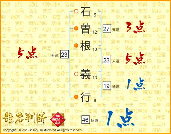 石(5画)曽(12画)根(10画) 義(13画)行(6画)
