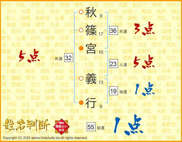 秋(9画)篠(17画)宮(10画) 義(13画)行(6画)