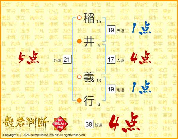 生活面を象徴する運勢です。外部から受ける影響力を表し、結婚運、家庭運や職場、環境への順応性を表します。総運から人運を引いた画数。姓や名が1文字の場合を除く。