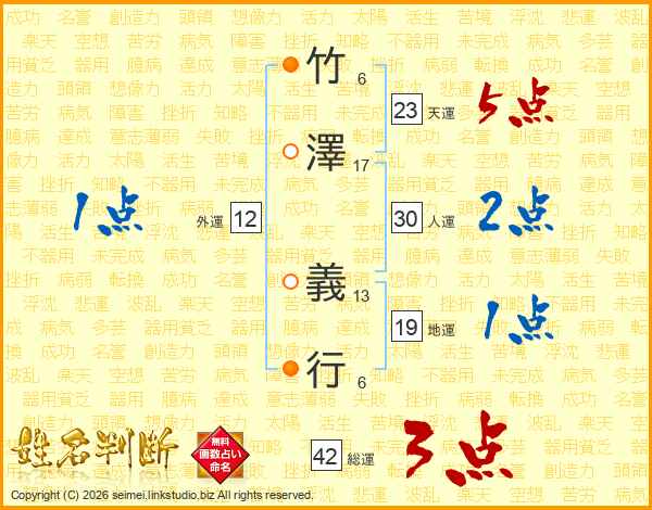 竹(6画)澤(17画) 義(13画)行(6画)