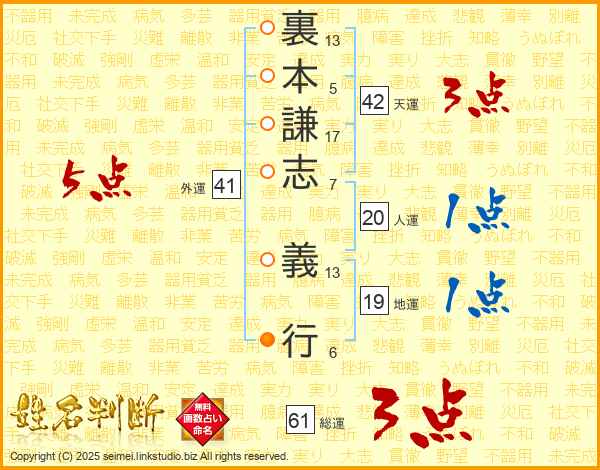 裏(13画)本(5画)謙(17画)志(7画) 義(13画)行(6画)