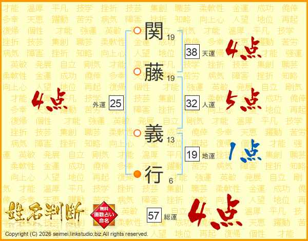 家系が持つ宿命的な運勢を表します。祖先から受け継いだ苗字ですので自分の力が及びません。家柄を象徴します。苗字の合計画数。
