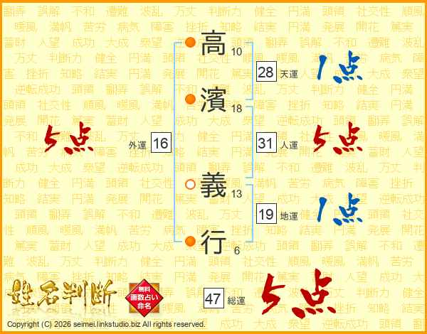 画数の奇数(○陽)と偶数(●陰)の配列で吉凶を占います。どちらかにかたよる名前は大凶名で避ける必要があります。画数の奇数偶数。