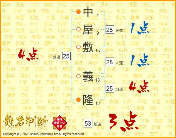 中(4画)屋(9画)敷(15画) 義(13画)隆(12画)