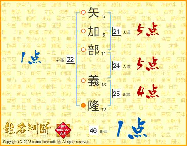 矢(5画)加(5画)部(11画) 義(13画)隆(12画)