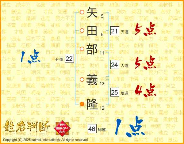 矢(5画)田(5画)部(11画) 義(13画)隆(12画)