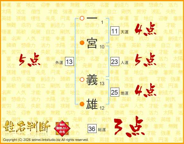 画数の奇数(○陽)と偶数(●陰)の配列で吉凶を占います。どちらかにかたよる名前は大凶名で避ける必要があります。画数の奇数偶数。