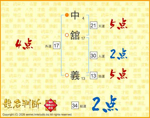 あなたの人生を表す1番重要な運勢です。生涯を通じて影響する総合運となり、主に50歳以降の晩年期に影響を及ぼします。苗字と名前の合計画数。