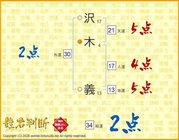 あなたの人生を表す1番重要な運勢です。生涯を通じて影響する総合運となり、主に50歳以降の晩年期に影響を及ぼします。苗字と名前の合計画数。