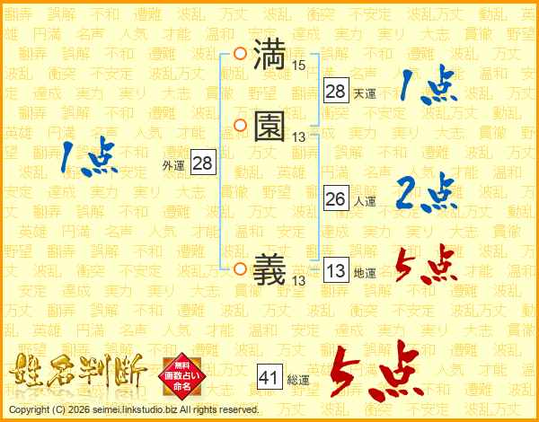 あなたの人生を表す1番重要な運勢です。生涯を通じて影響する総合運となり、主に50歳以降の晩年期に影響を及ぼします。苗字と名前の合計画数。