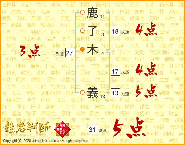 鹿(11画)子(3画)木(4画) 義(13画)