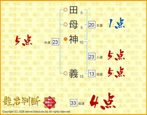 生活面を象徴する運勢です。外部から受ける影響力を表し、結婚運、家庭運や職場、環境への順応性を表します。総運から人運を引いた画数。姓や名が1文字の場合を除く。