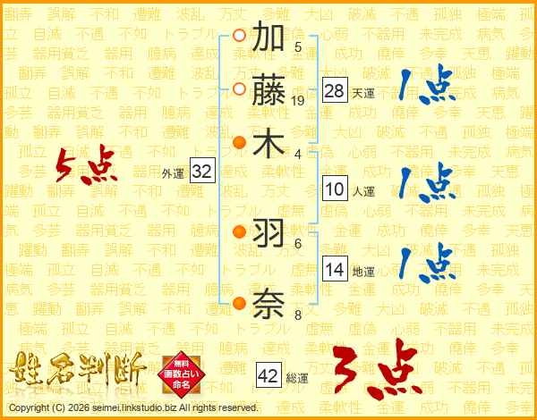 加(5画)藤(19画)木(4画) 羽(6画)奈(8画)