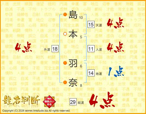 島(10画)本(5画) 羽(6画)奈(8画)
