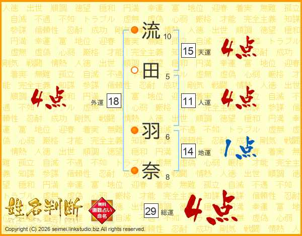 生活面を象徴する運勢です。外部から受ける影響力を表し、結婚運、家庭運や職場、環境への順応性を表します。総運から人運を引いた画数。姓や名が1文字の場合を除く。
