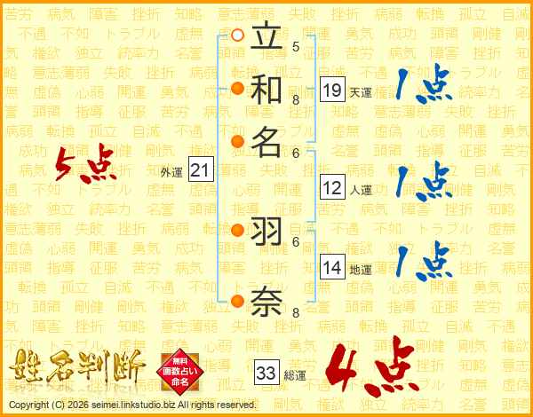 立(5画)和(8画)名(6画) 羽(6画)奈(8画)