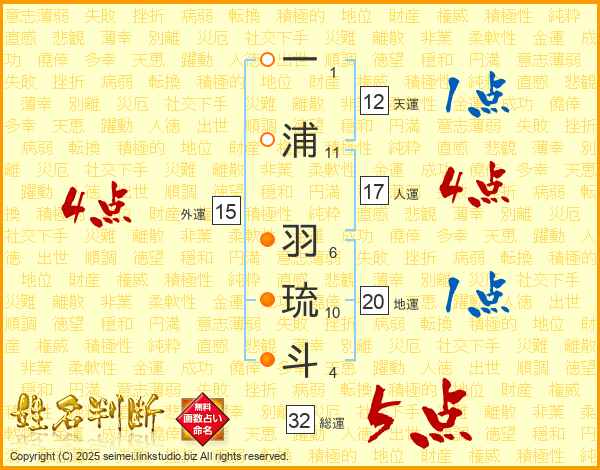 一(1画)浦(11画) 羽(6画)琉(10画)斗(4画)
