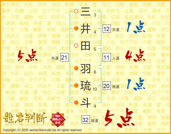 三(3画)井(4画)田(5画) 羽(6画)琉(10画)斗(4画)