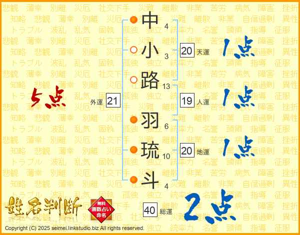 生活面を象徴する運勢です。外部から受ける影響力を表し、結婚運、家庭運や職場、環境への順応性を表します。総運から人運を引いた画数。姓や名が1文字の場合を除く。