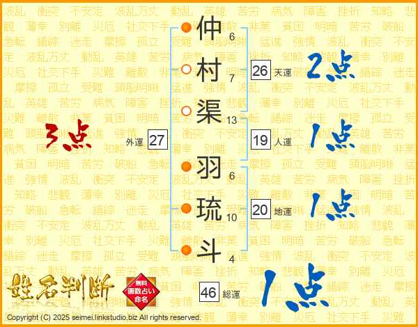 仲(6画)村(7画)渠(13画) 羽(6画)琉(10画)斗(4画)