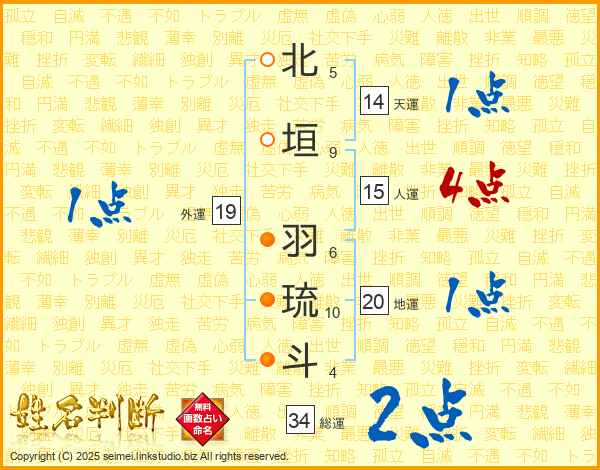 北(5画)垣(9画) 羽(6画)琉(10画)斗(4画)
