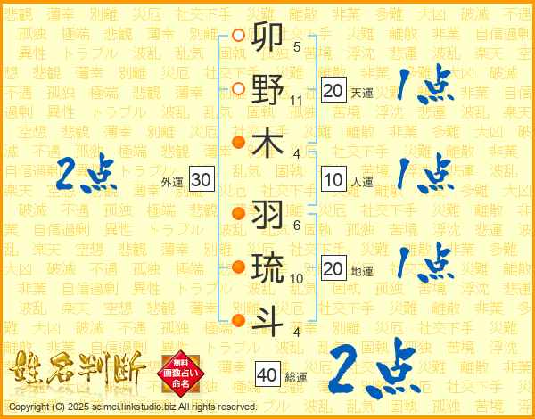 卯(5画)野(11画)木(4画) 羽(6画)琉(10画)斗(4画)