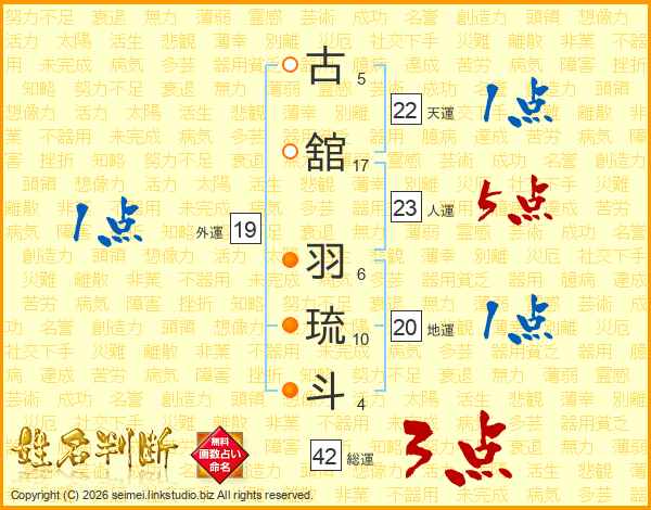 古(5画)舘(17画) 羽(6画)琉(10画)斗(4画)